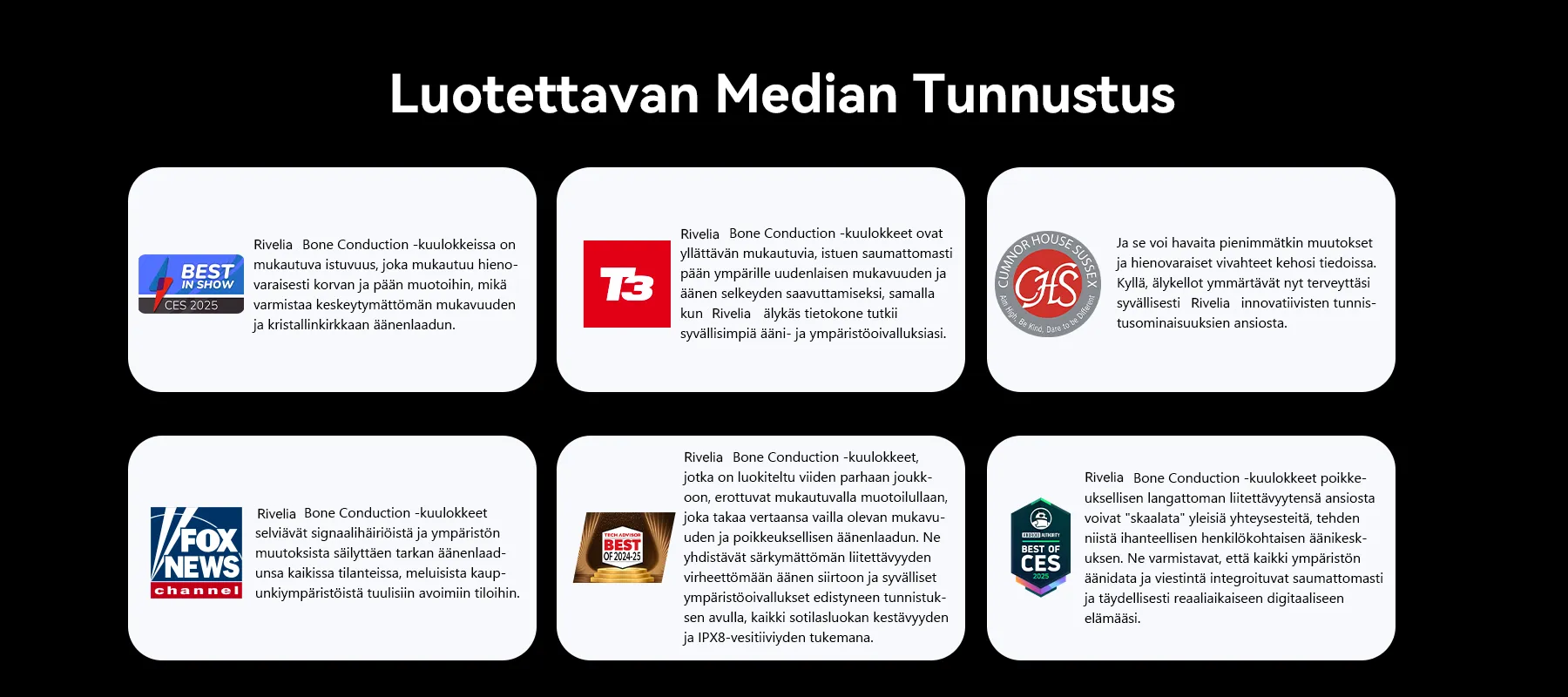 Rivelia tarina alkoi tohtori Anya Sharmasta, intohimoisesta audiofiilistä ja kaupunkipyöräilijästä, joka oli turhautunut selkeän äänen ja tilannetietoisuuden puutteesta kiireisessä kaupunkiympäristössään. Omien haasteidensa innoittamana hän päätti luoda Rivelia-luuääni-kuulokkeet, jotka on rakennettu vakaviin jokapäiväisiin vaatimuksiin ja dynaamisiin elämäntapoihin.