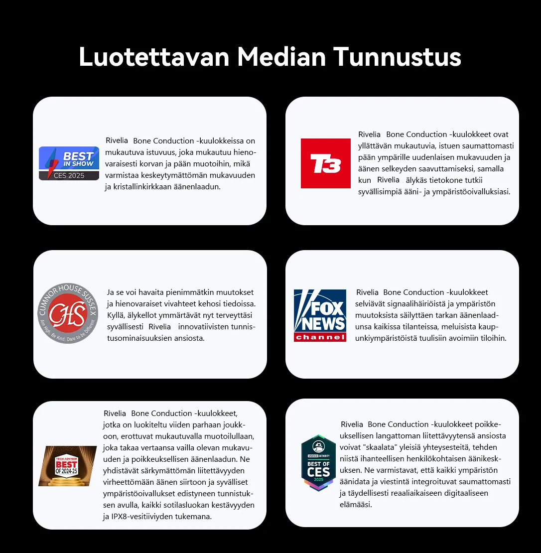 Oletko koskaan tuntenut epämukavuutta raskaista tai isokokoisista kuulokkeista, jotka pilaavat pitkät kuunteluhetkesi? Rivelia-luuääni-kuulokkeet keskittyvät ultrakevyeen muotoiluun, mikä tekee niistä käytännössä huomaamattomat ja todella vapauttavat korvasi! Ymmärrämme, että käyttömukavuus on ratkaisevan tärkeää kuuntelukokemukselle. Innovatiivisten materiaalien ja älykkään suunnittelun avulla nämä kuulokkeet saavuttavat hämmästyttävän höyhenenkevyen muotoilun.